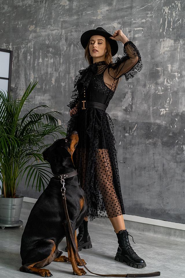 Egy igazán különleges, légies ruha, amely finom, pöttyös tüll anyagból készült. Tökéletesen illeszkedik a test vonalaihoz. Deréknál egy öv található arany színű csattal. Elöl díszgombokkal záródik, amelyek szintén dekoratív elemei a ruhának. A könnyed fazont fodrok díszítik, amelyek romantikus megjelenést adnak.