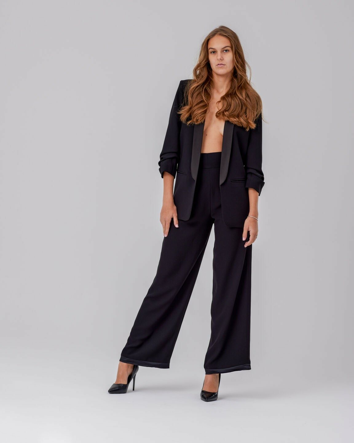 A szetthez széles szabású, „táncoló” nadrág tartozik, magas derékkal és bő szárakkal, amely tökéletesen kiegészíti a blézert. A nadrágszárak alján található selyem díszítés finom eleganciát ad, míg az univerzális fazon lehetővé teszi, hogy magas sarkú cipőkkel és sportos sneakerekkel egyaránt viseld.