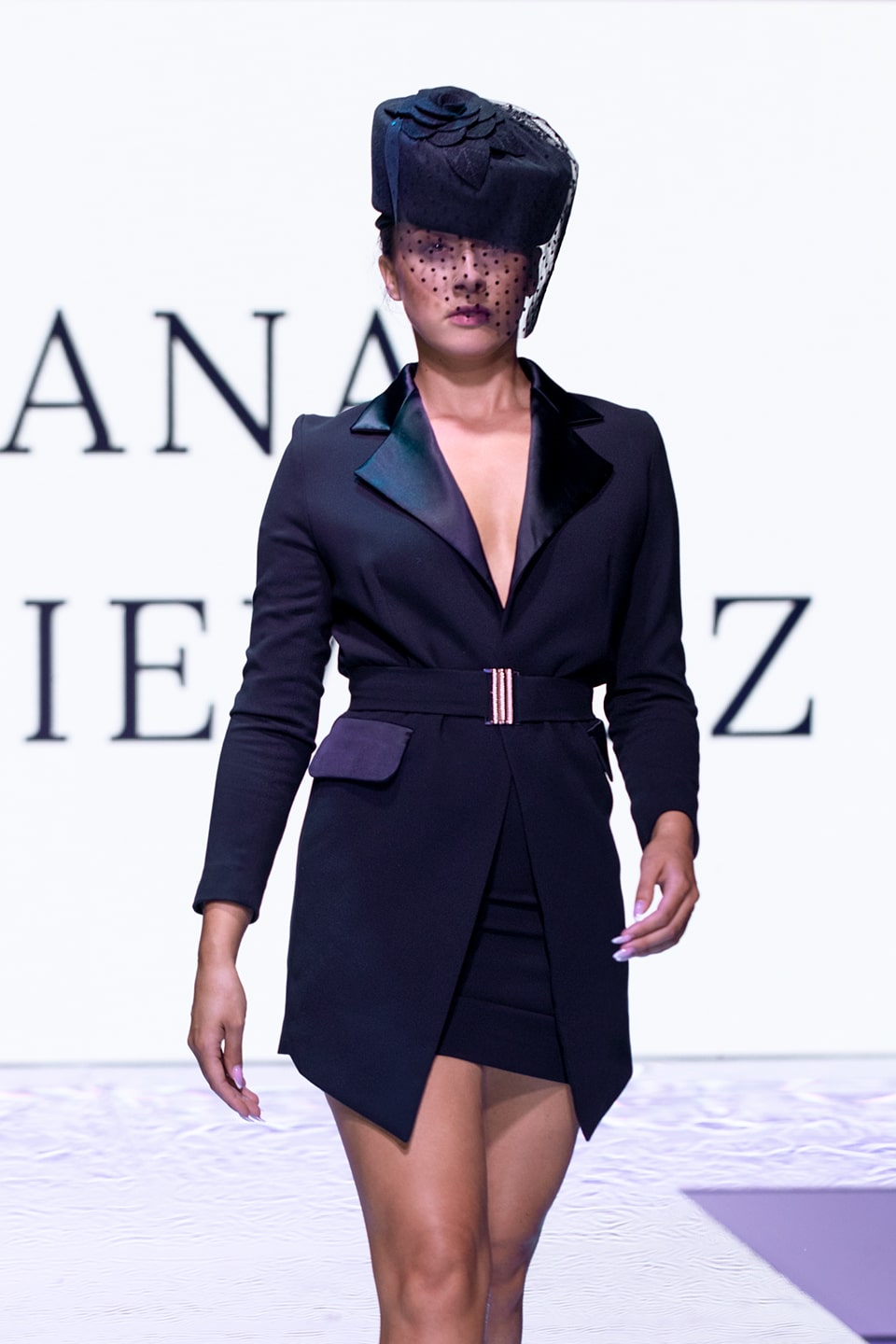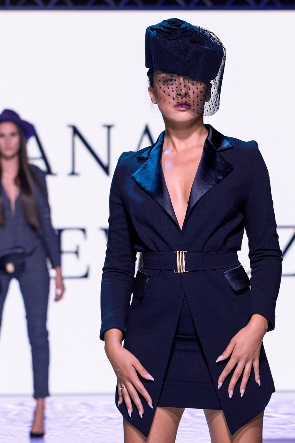 Elegáns, fekete kosztüm rendkívül nőies szabással, amely szépen kiemeli az alakot. A szett része egy testhezálló szoknya és egy stílusos, övvel záródó blézer, amely alul finoman szétterül, így „darázsderék” hatást kölcsönöz az összhatásnak. Tökéletes választás üzleti találkozókra és formális alkalmakra, ahol a klasszikus elegancia modern megjelenéssel párosul.