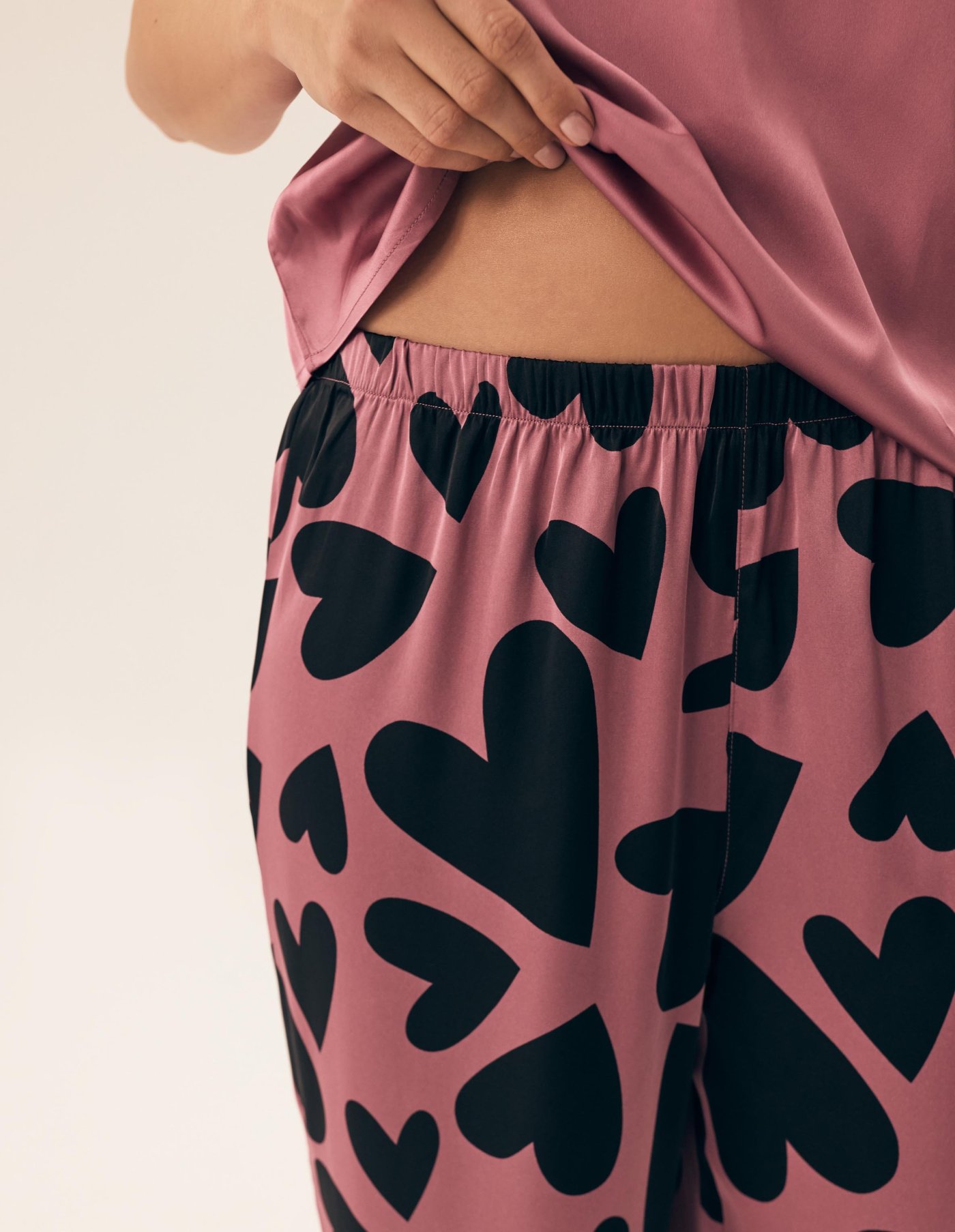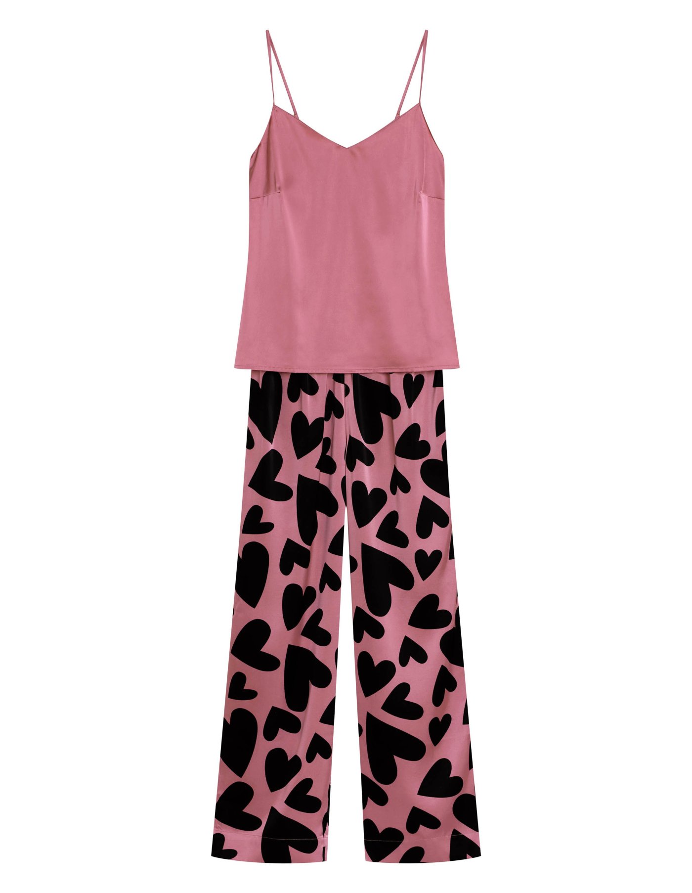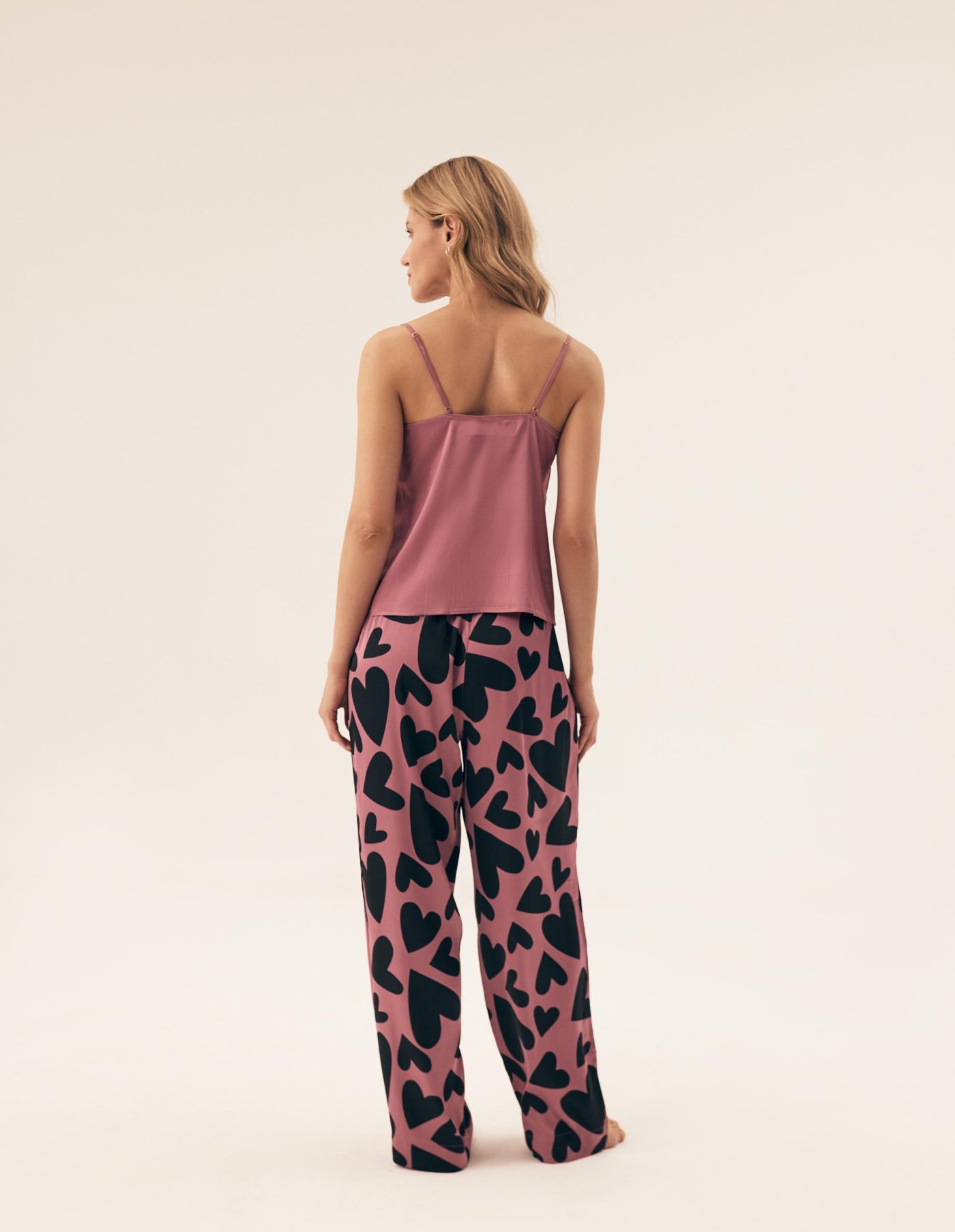 A szatén pizsama szett, amely egy topból és hosszú, laza nadrágból áll, ideális választás a kényelmet kedvelő nők számára. A szívmintás nyomtatás különleges karaktert kölcsönöz a Jenya pizsamának. A top állítható pántokkal rendelkezik, V-dekoltázzsal és dekoratív szívmintával a nadrág szárain. Ez a szett tökéletes választás a pihentető estékre és a kényelmes otthoni viselethez!