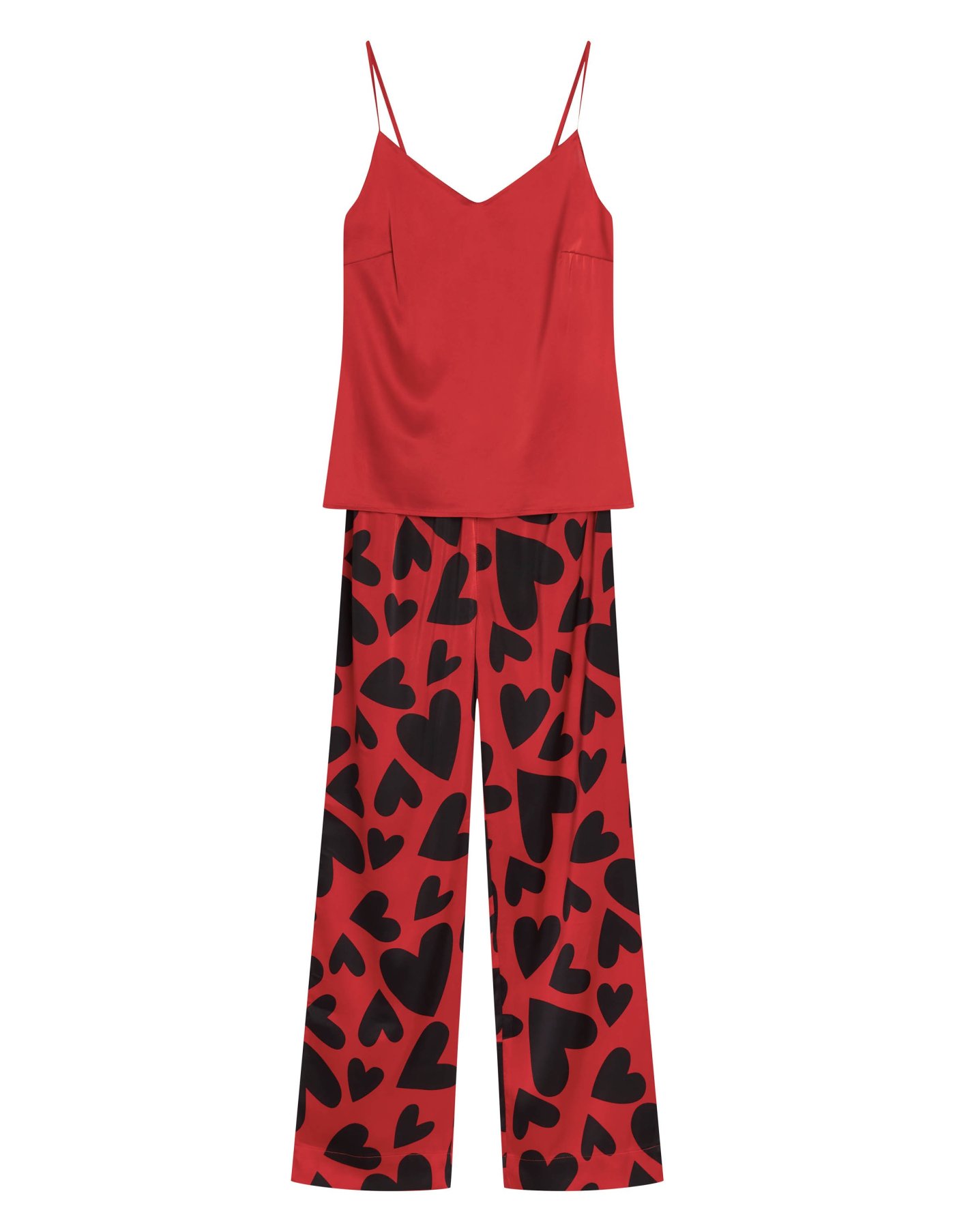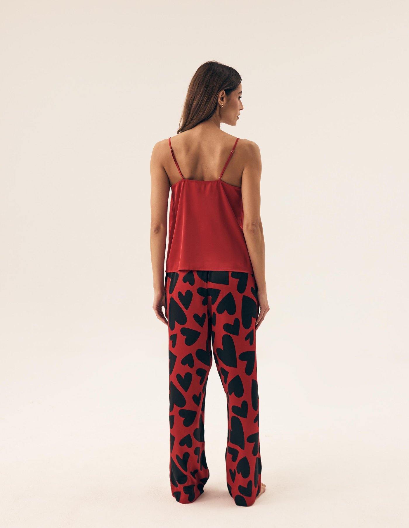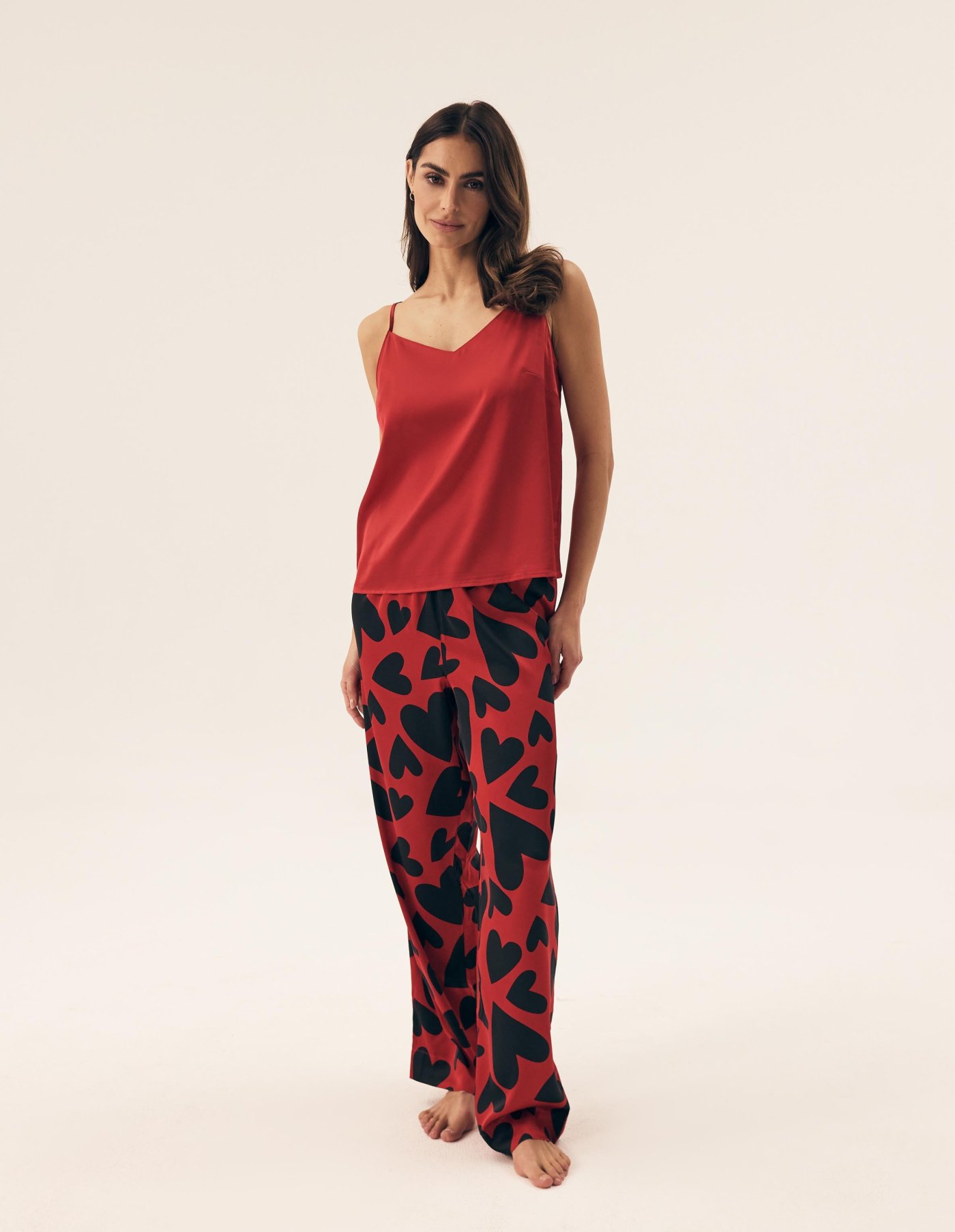A Jenya márkájú piros női pizsama az Esotiq-tól a kényelem és a dizájn iránti szenvedélyt értékelő nők számára készült. A szett egy topból és egy laza lábú nadrágból áll, derékban gumival, ami tökéletes Valentin-napi ajándék. A top vékony, állítható pántokkal és V-dekoltárral rendelkezik, míg a nadrág dekoratív szívmintával díszített a lábszáron.