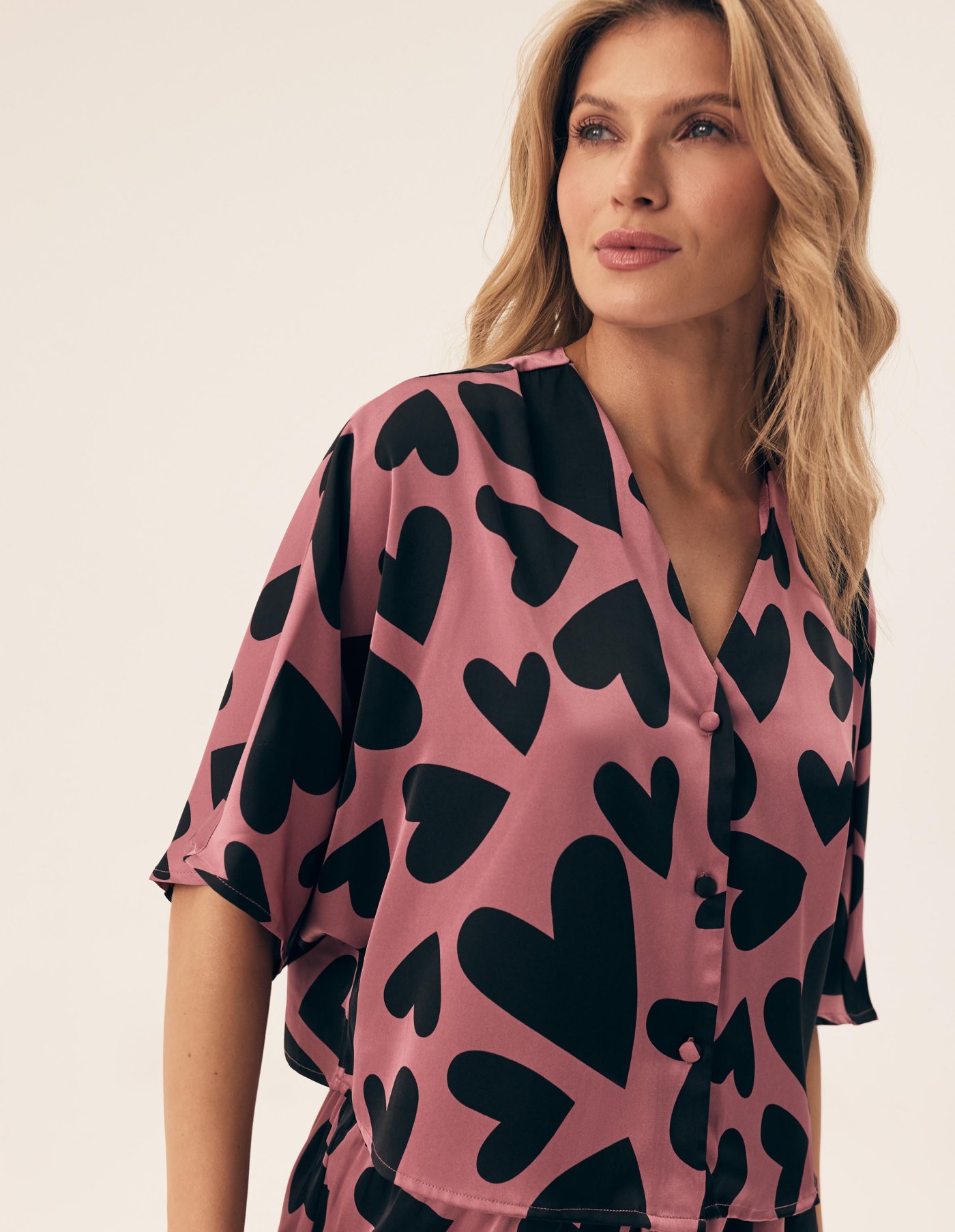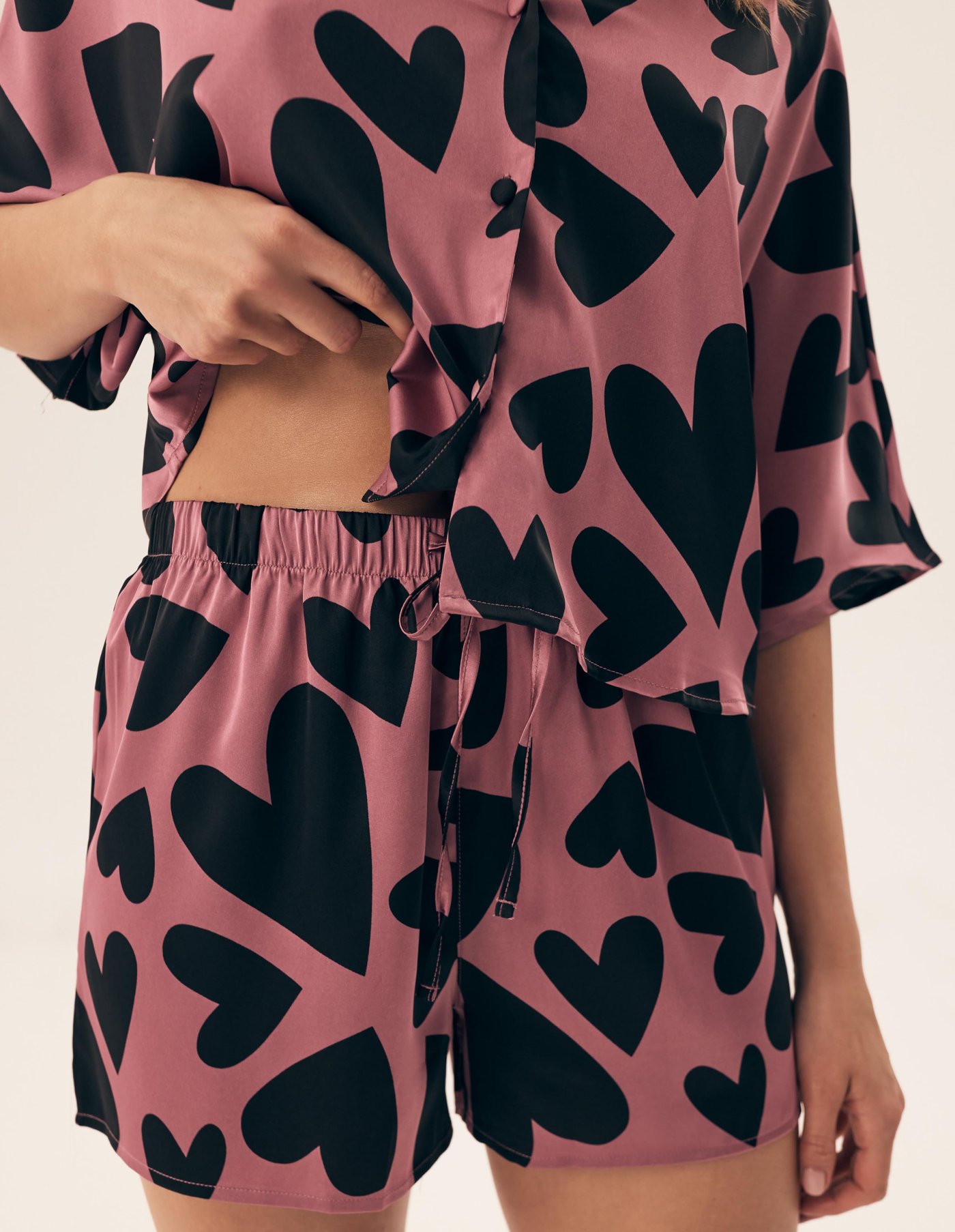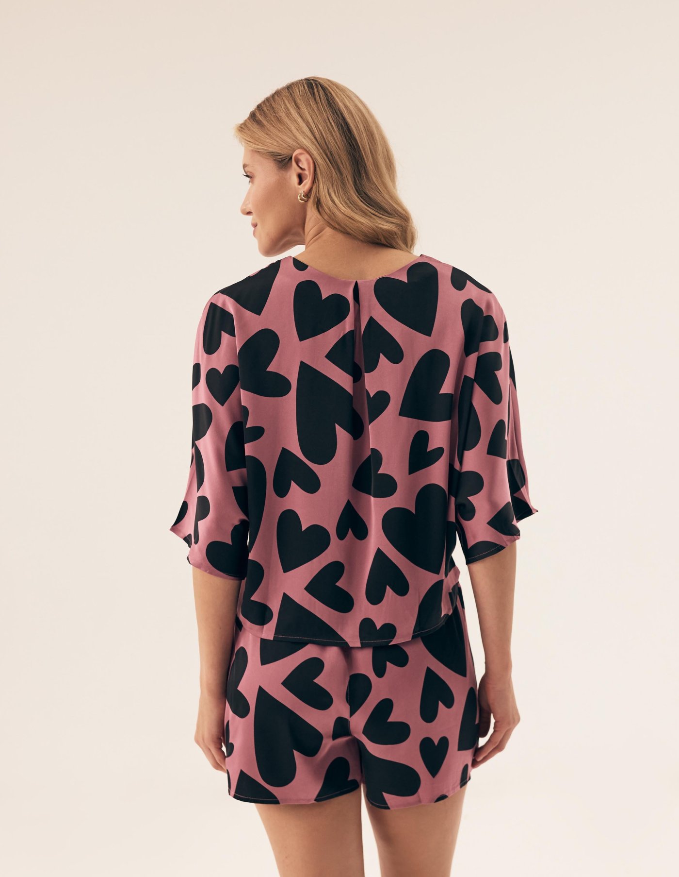 A Rózowa pizsama fekete szívmintával rendelkező, rövid ujjú változata a női Jenya szett. Fedezd fel az új Esotiq pizsamát, amely egy könnyed, laza, pillangó ujjú blúzból és gumírozott derékú sortból áll, állítható zsinórral. A különleges nyomtatás Valentin-napi hangulatot kölcsönöz a szettnek. A blúz könyökig érő ujjakkal és gombos záródással készült, míg a dekoratív szívnyomás egyedi megjelenést biztosít.