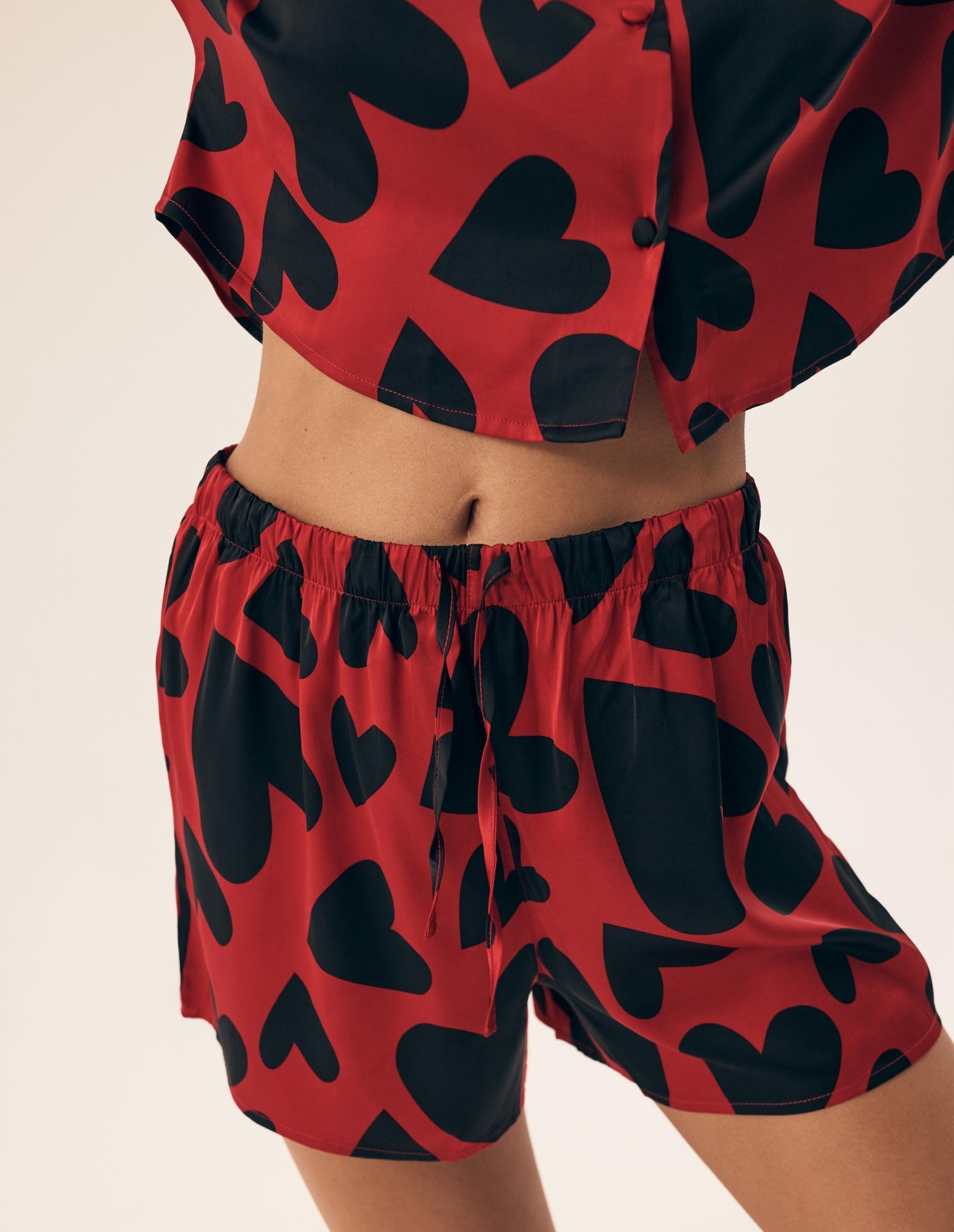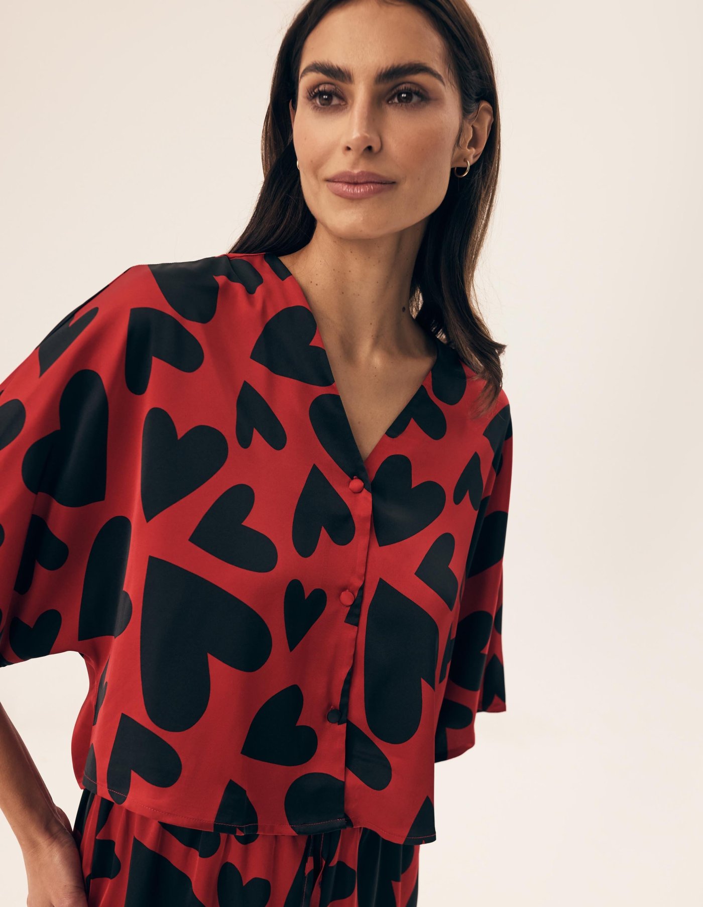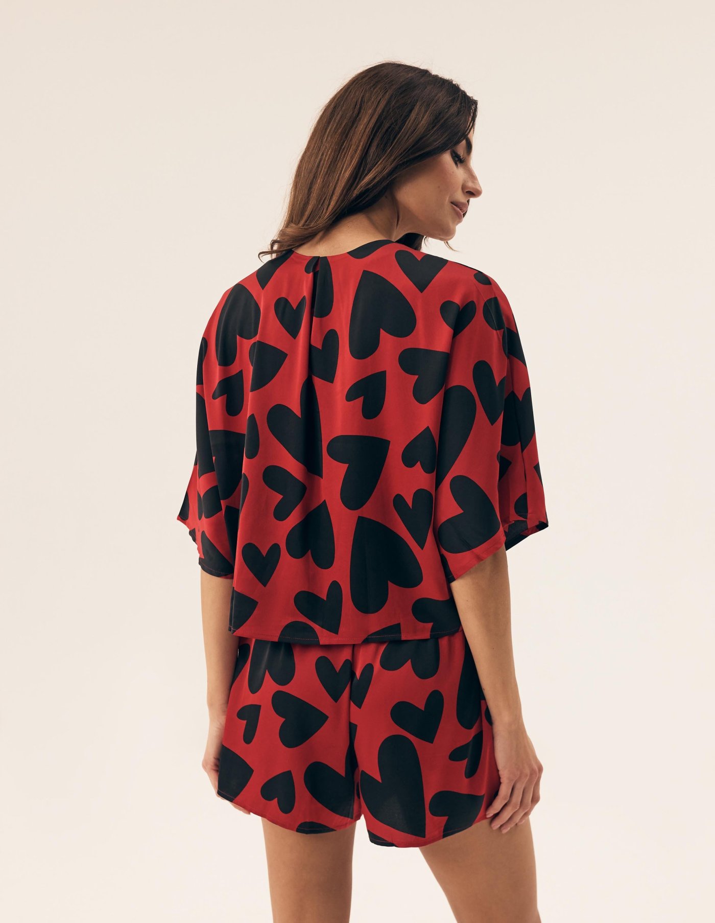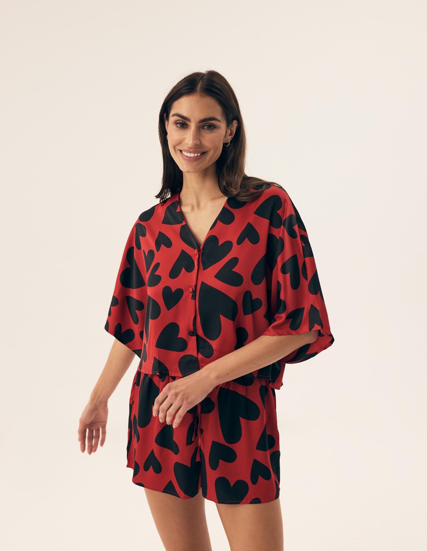 A Jenya rövid ujjú változata egy női szett, amely szívmintás dizájnnal rendelkezik. A Jenya szett egy könnyed, laza, pillangó ujjú blúzból és gumírozott derékú sortból áll, amelyhez állítható zsinór is tartozik. A blúza könyökig érő ujjakkal és gombos záródással készült, míg a dekoratív szívnyomás egyedi megjelenést kölcsönöz az egész szettnek