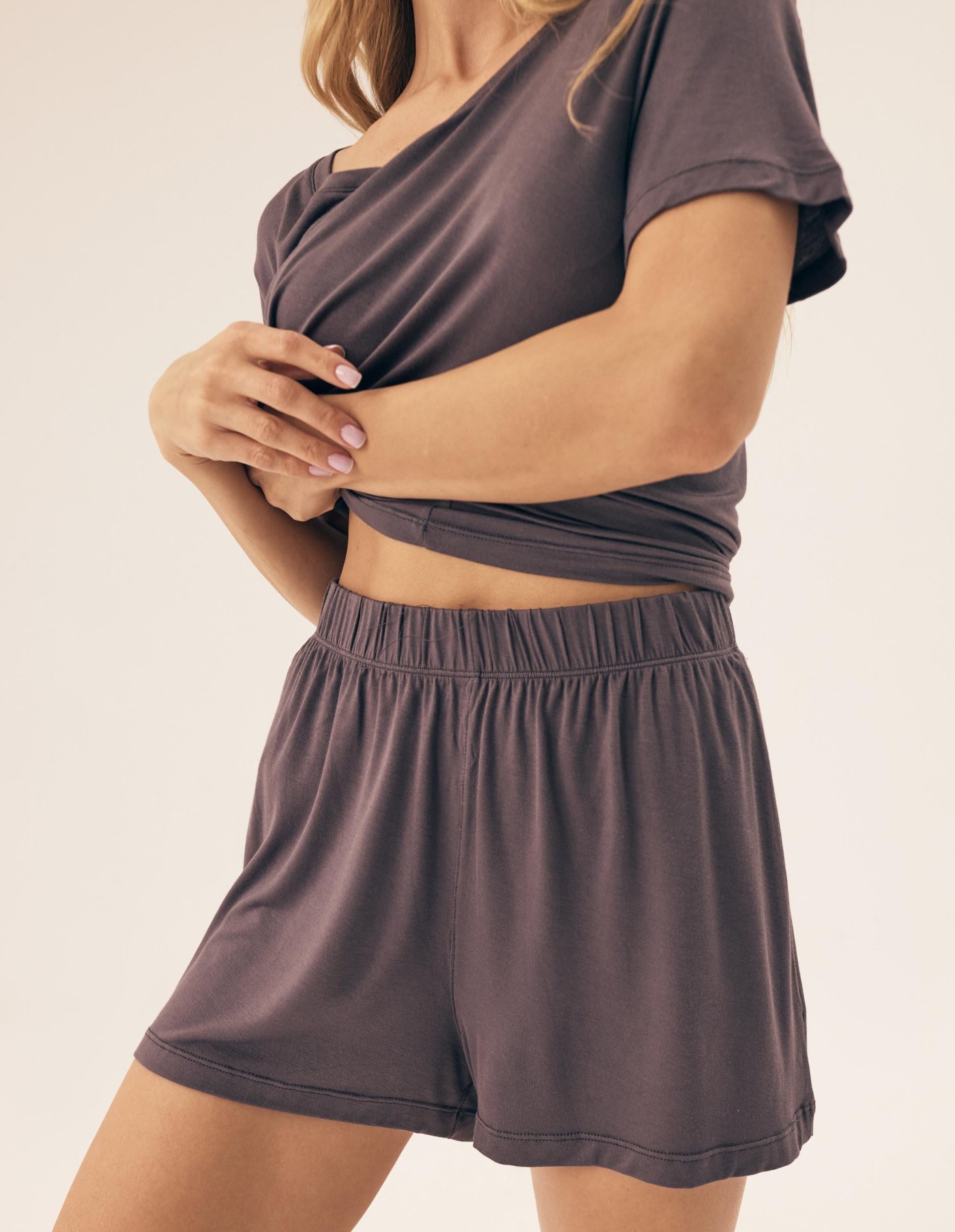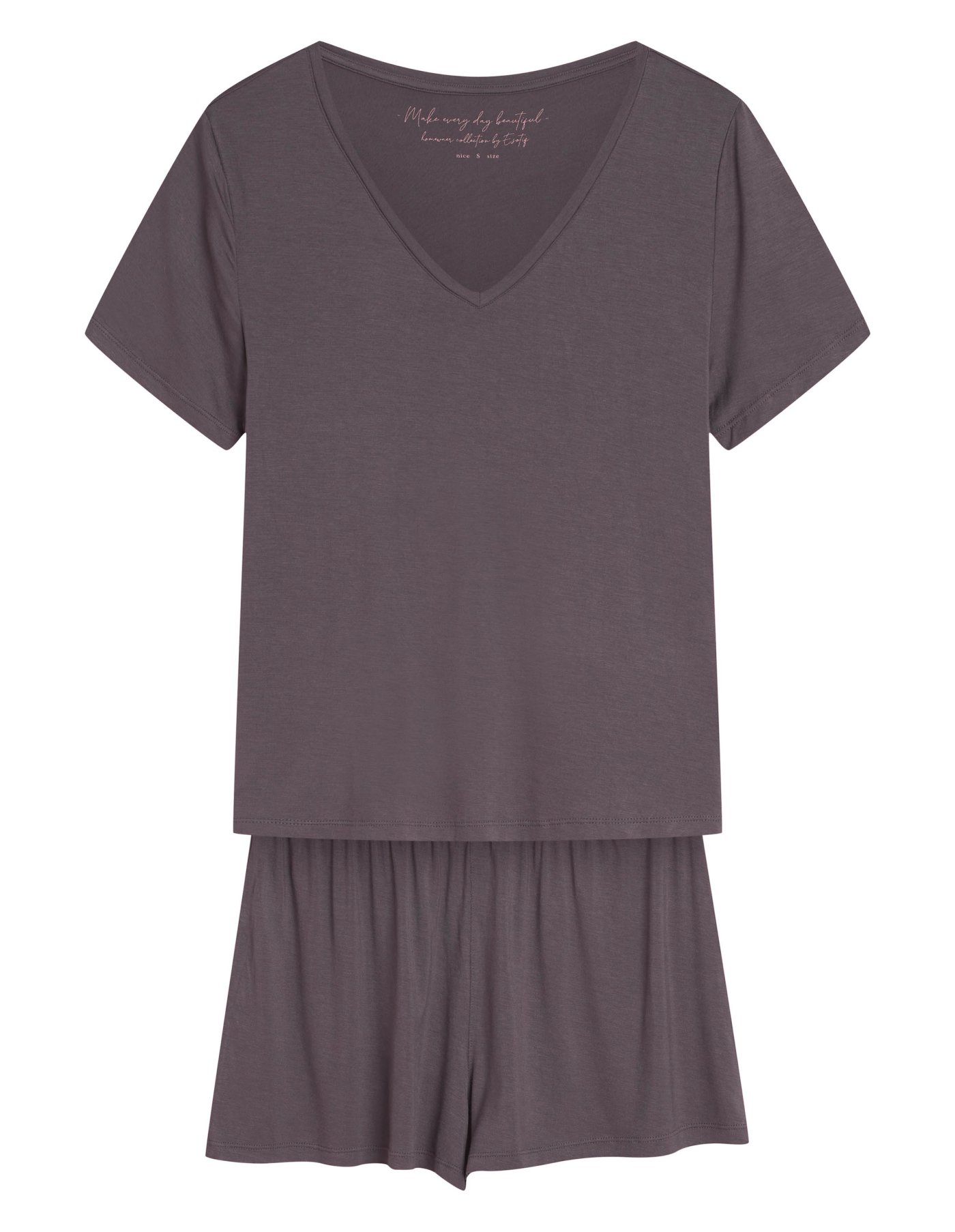A szürke pizsama rövid ujjú blúzból és rövid nadrágból áll. Puha anyagból készült, amely kellemesen simul a bőrhöz. A pizsama jellemzői közé tartozik a rövid ujjú blúz, az elasztikus derékkal ellátott nadrág, valamint a kellemes tapintású anyag, amely biztosítja a kényelmet az éjszakai pihenés során.