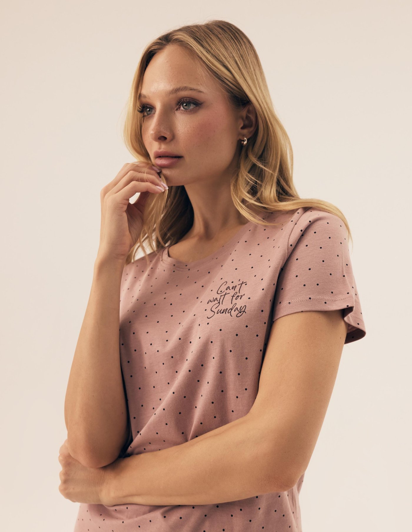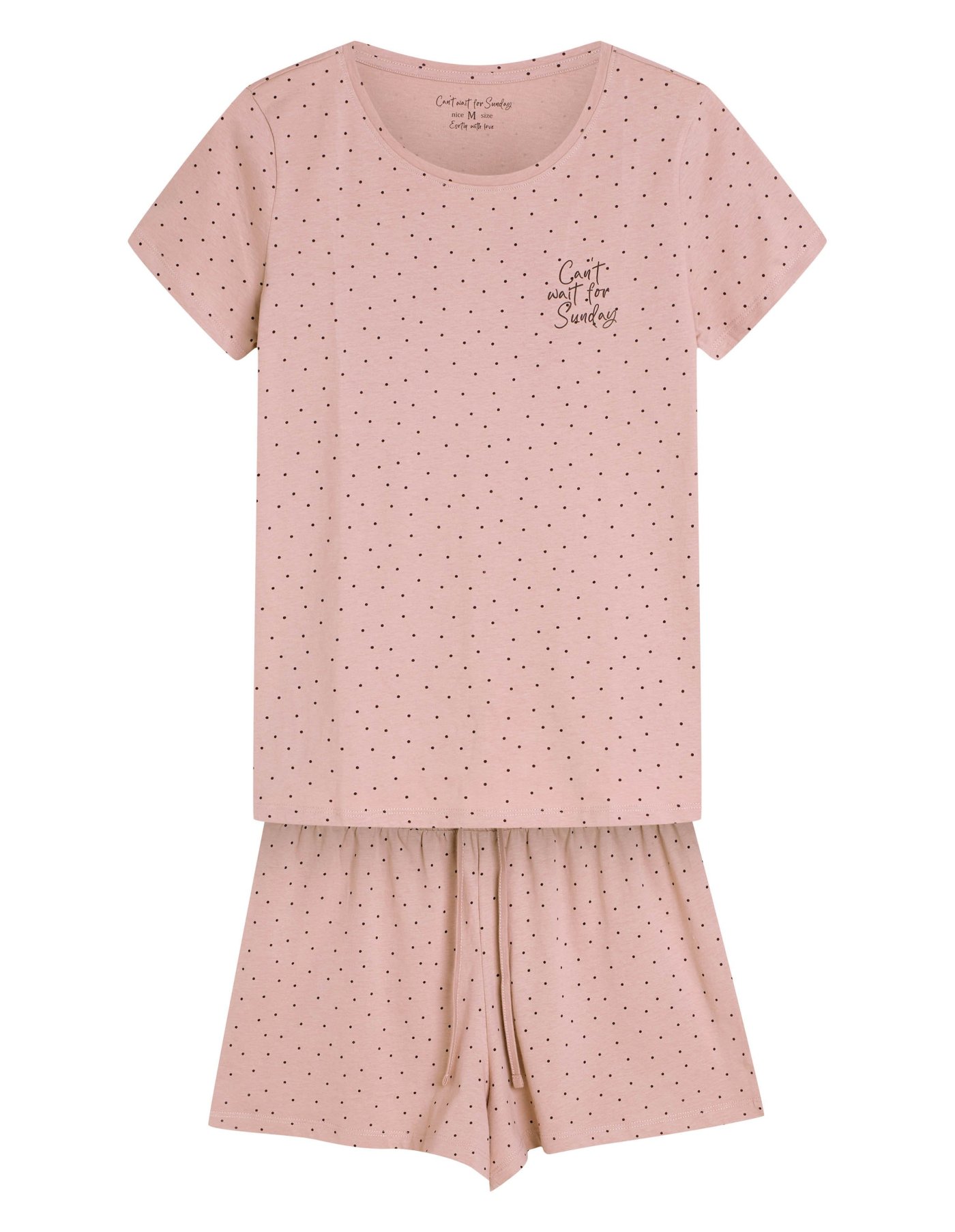 Lágy, női pizsama Renya, amely ideális tavaszra és nyárra. Ismerd meg új modellünket! A szett egy rövid ujjú pólóból áll, amelyen nyomtatott minta található a mellrészen, valamint rövidnadrágból, amely gumival és zsinórral van ellátva a deréknál.