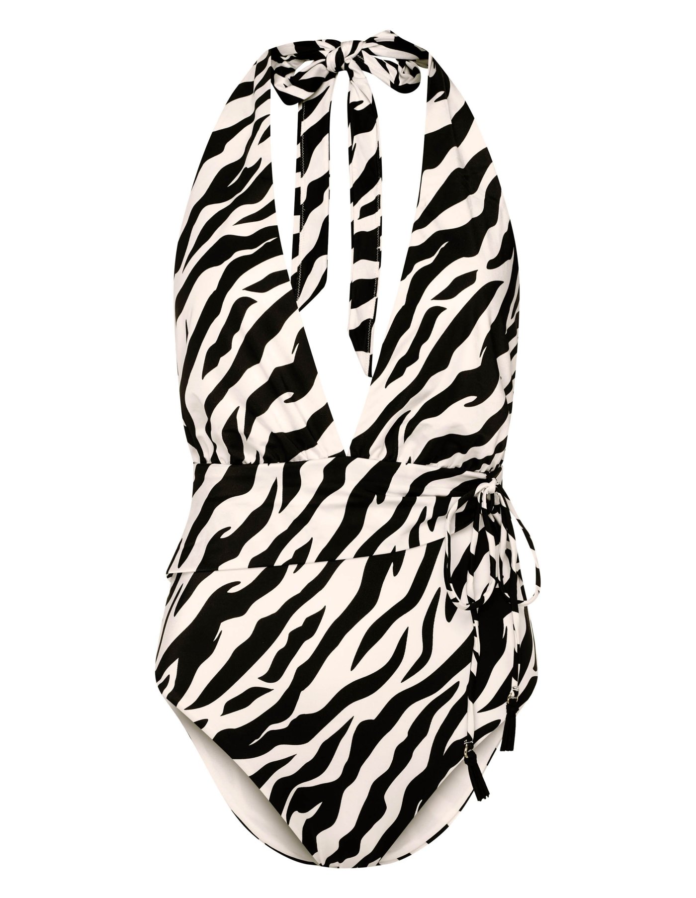 A Zibraz egyrészes fürdőruha vonzó állatmintával és formával rendelkezik. A nyak mögött kötődik, teljesen szabadon hagyva a hátat, míg elöl mély V-alakú dekoltázzsal büszkélkedhet. A derék drapált, és a kötés a háton található. Két színváltozatban elérhető, vonzó dekoltázs jellemzi, és a nyakra kötés lehetővé teszi a melltartóhoz való igazítást.