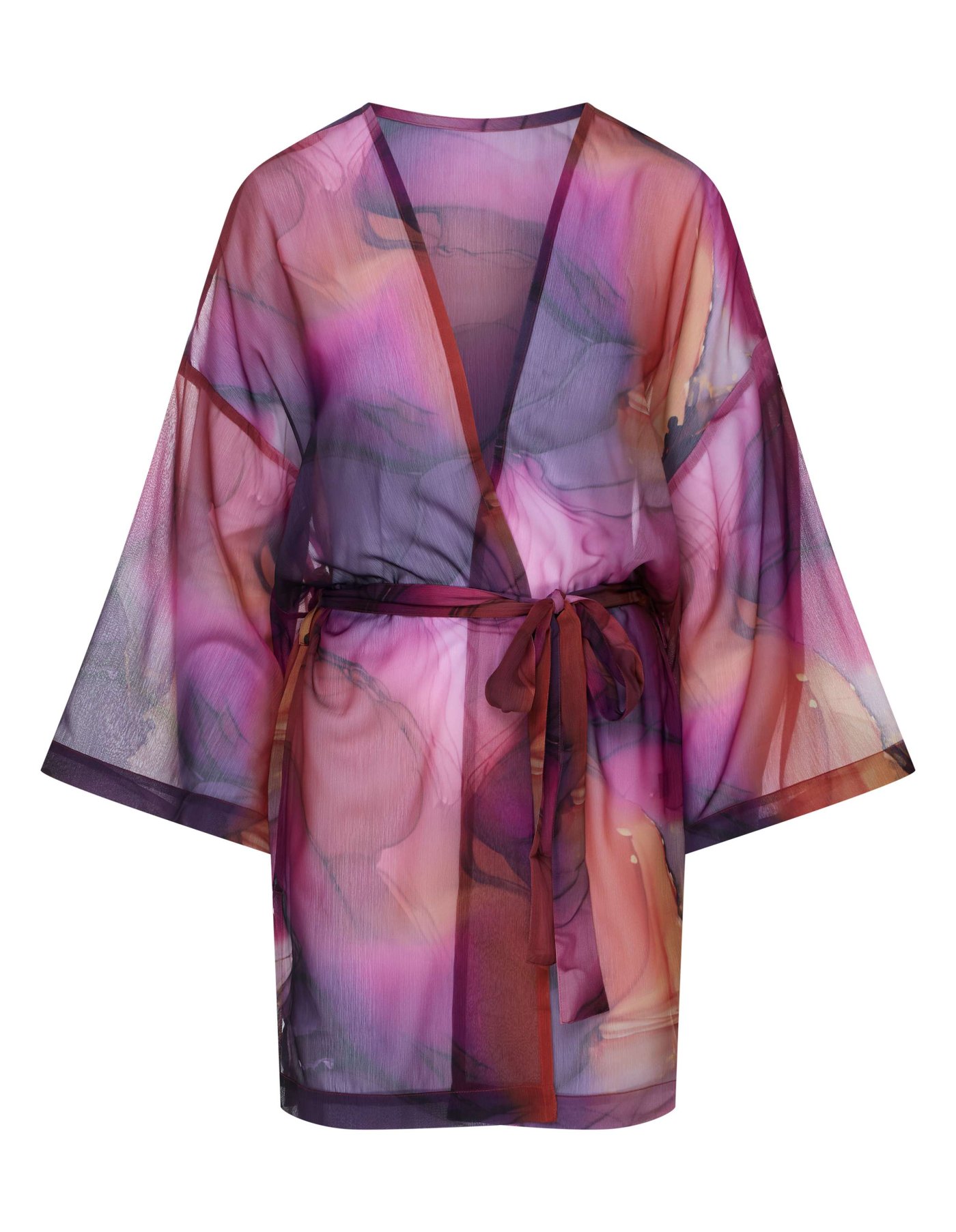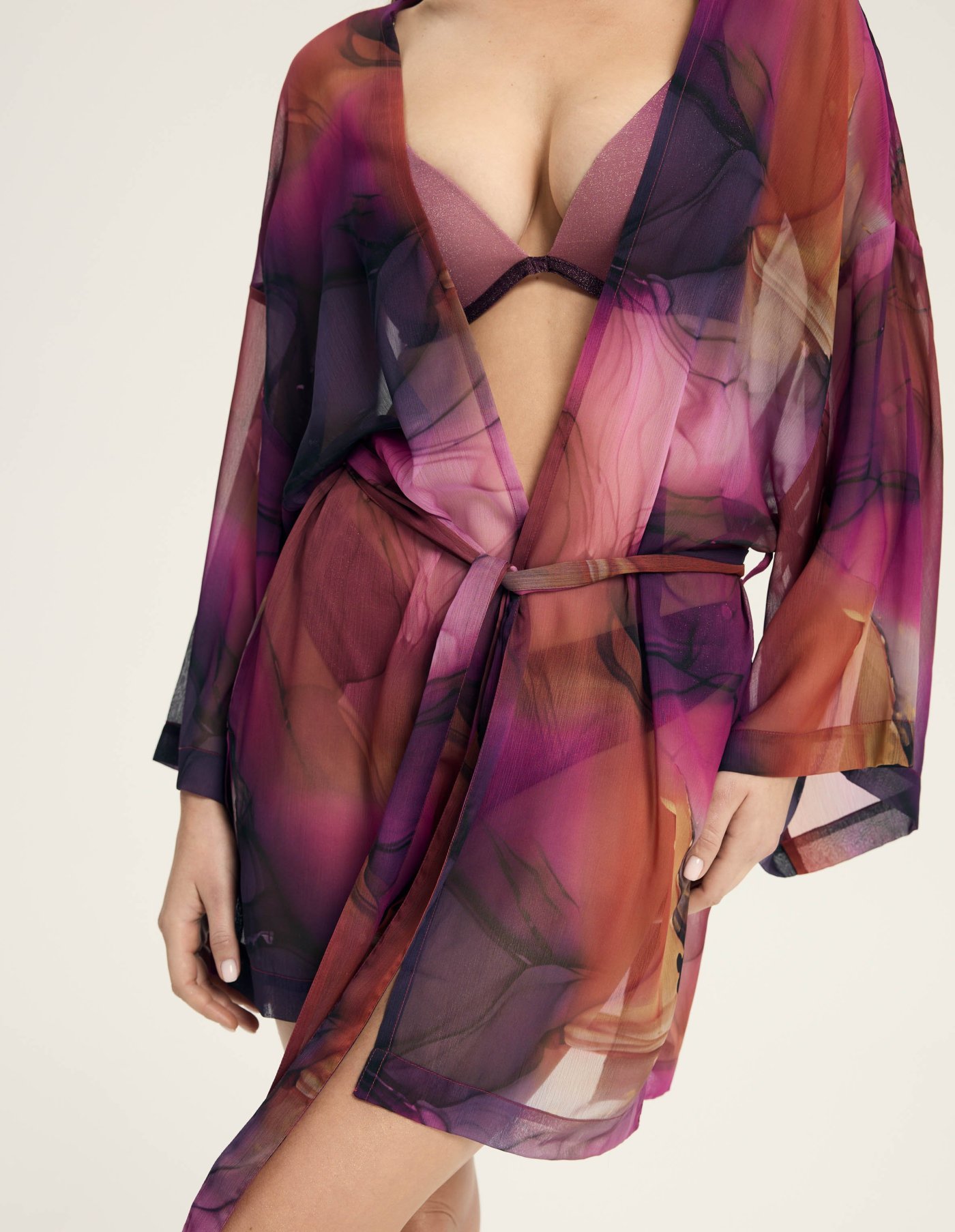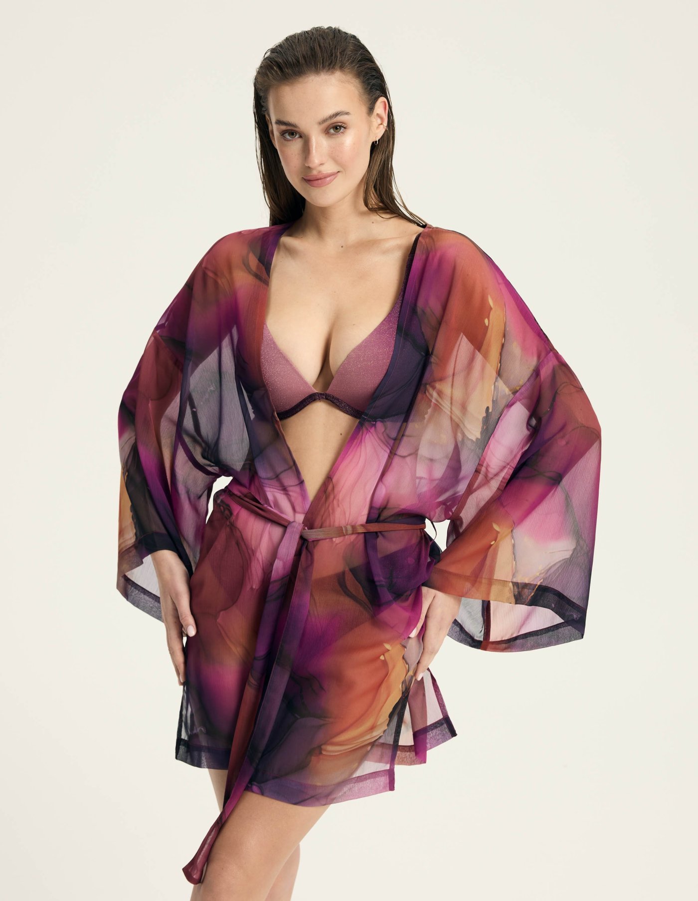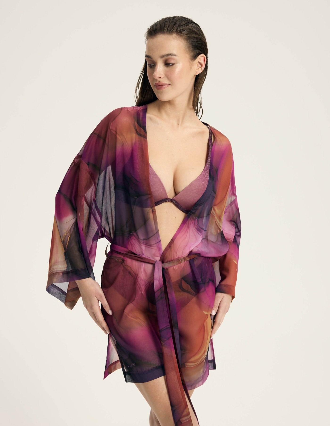 A Tango sifon fürdőköntös különleges festői mintázattal rendelkezik, amely ideálisan alkalmas a strandra vagy a medence mellé. A deréknál kötőszalaggal ellátott köntös hossza a térd fölé ér, széles, légies ujjakkal készült. Kényelmes és stílusos választás a nyári napokra, amely tökéletesen kiegészíti a fürdőruhákat.
