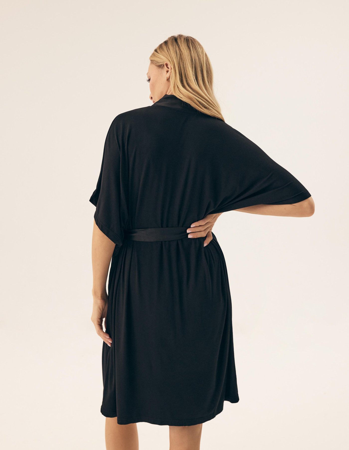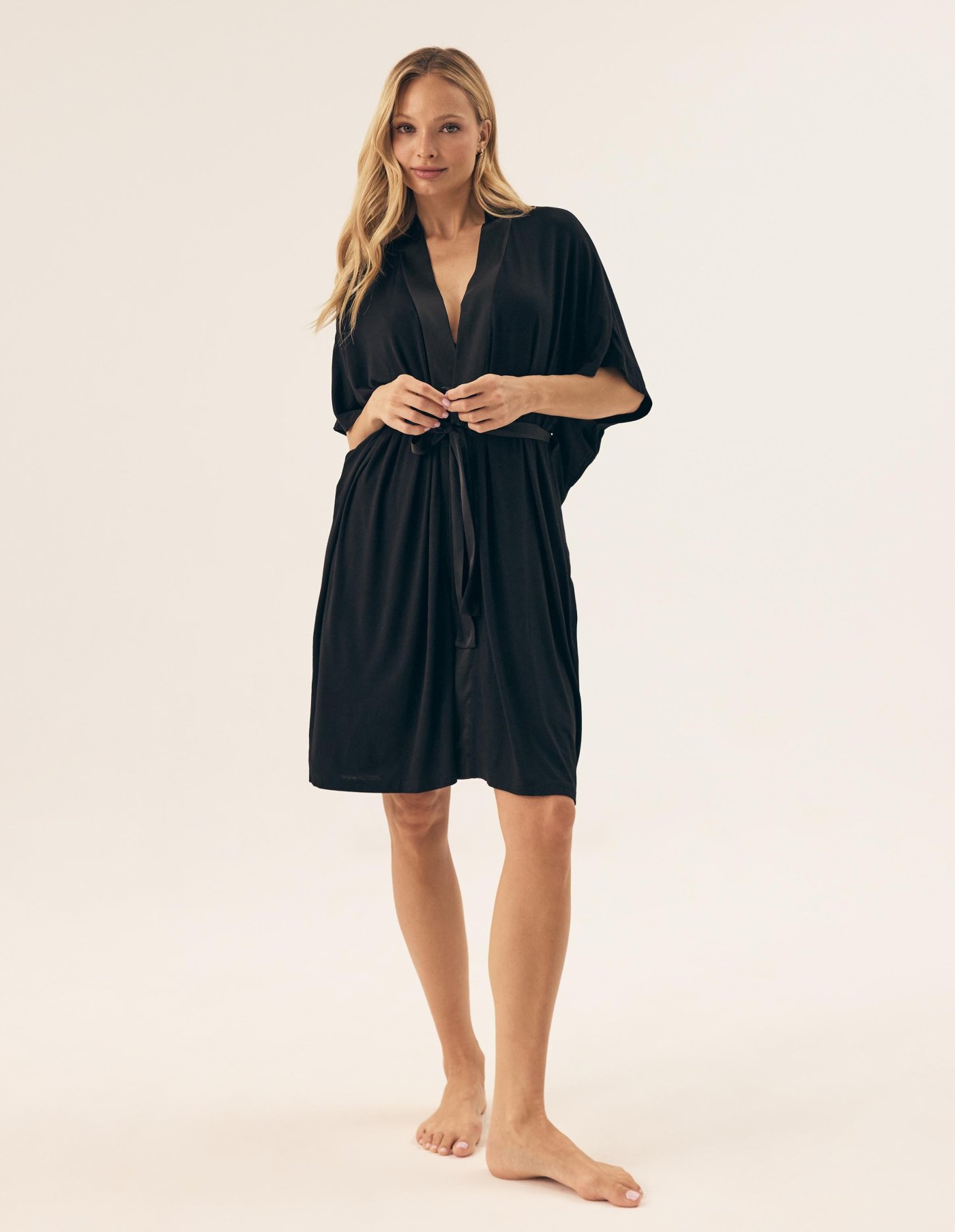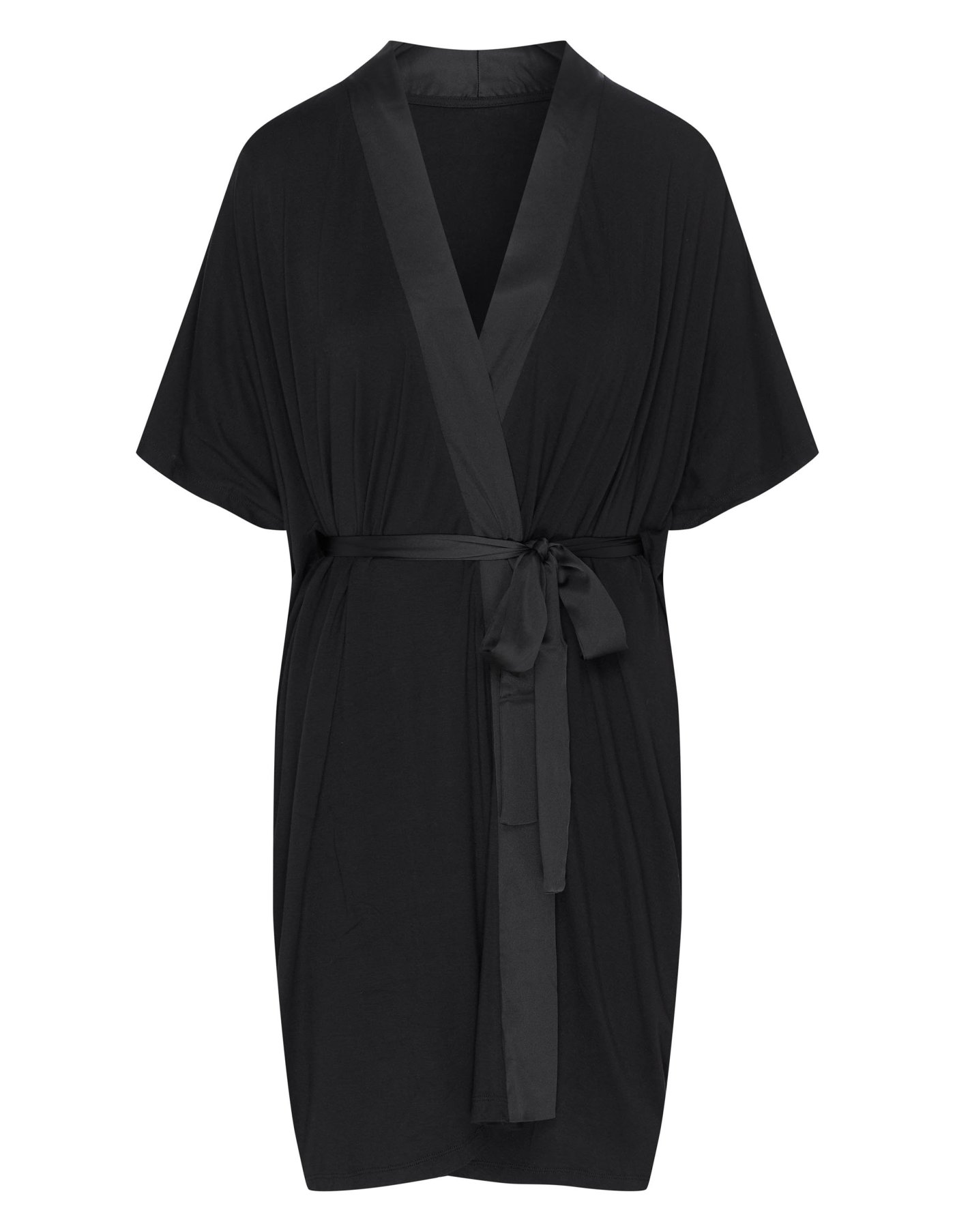 A Rirri rövid kötött köntös deréknál kötőszalaggal rendelkezik. Puha, folyékony viszkóz anyagból készült, fényes selyem hatású kivitelezéssel. Hosszú ujjú, térd hosszúságú, ideális választás fekete éjszakai blúzokhoz. Kényelmes és elegáns megjelenést biztosít, tökéletes kiegészítője az éjszakai viseletnek.