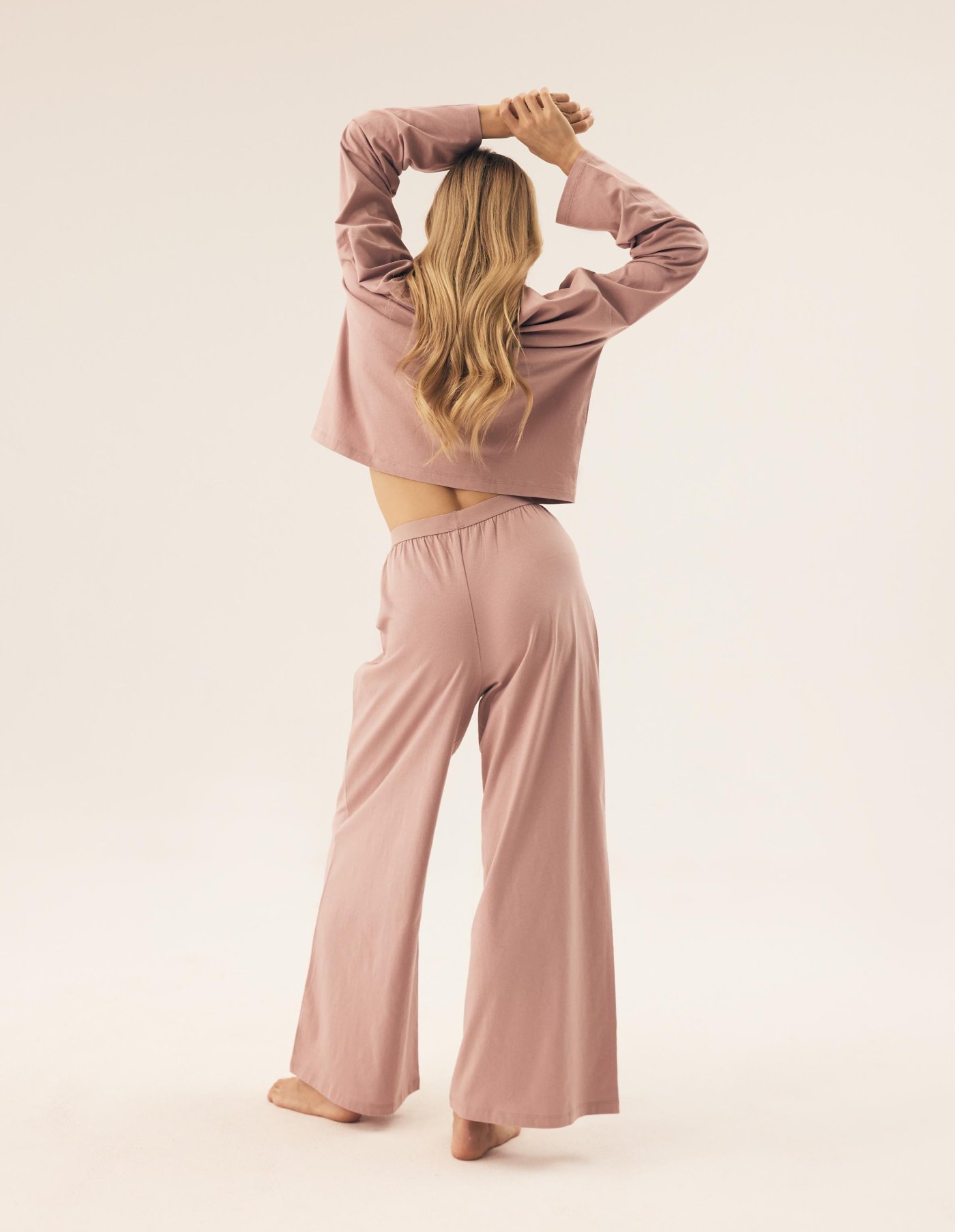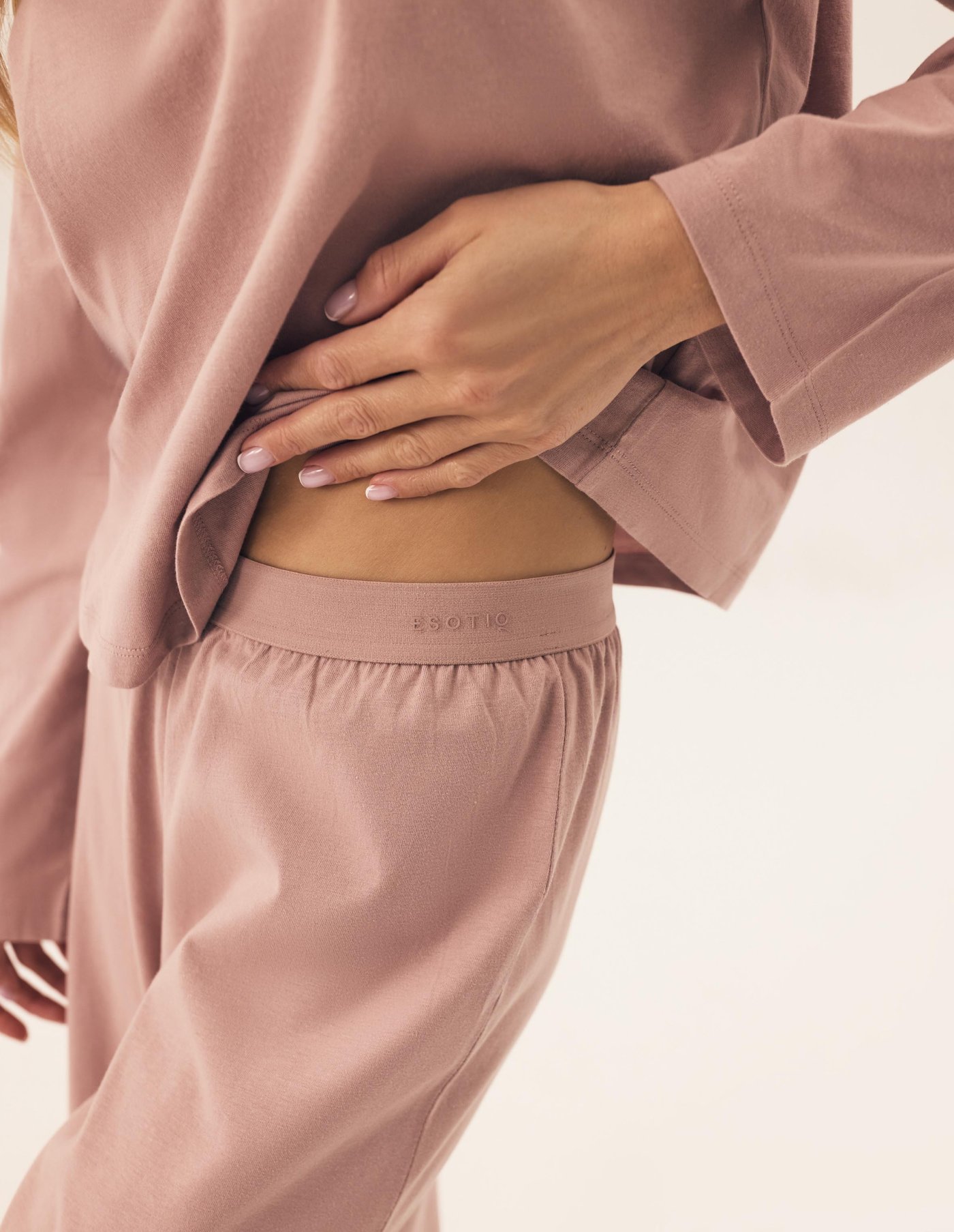 Ismerd meg a Ruthie női pamut nadrágot, amely hosszú szárú és rendkívül kényelmes. Keverd a rózsaszínt a feketével, variáld a különböző ujj- és nadrághosszak kombinációit. Igazi mix&match lehetőség, amellyel saját Ruthie Esotiq otthoni szettedet alkothatod meg. Két színváltozatban elérhető, gumis derékkal készült, laza, széles szárú nadrág.