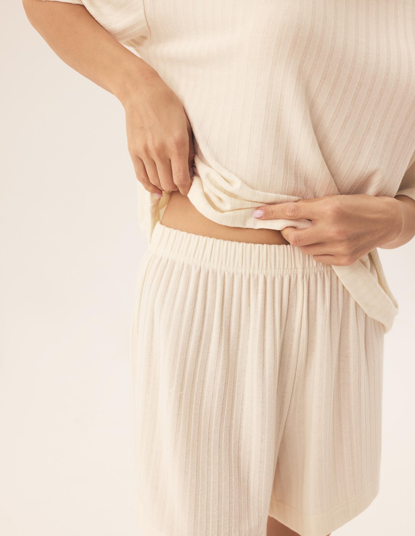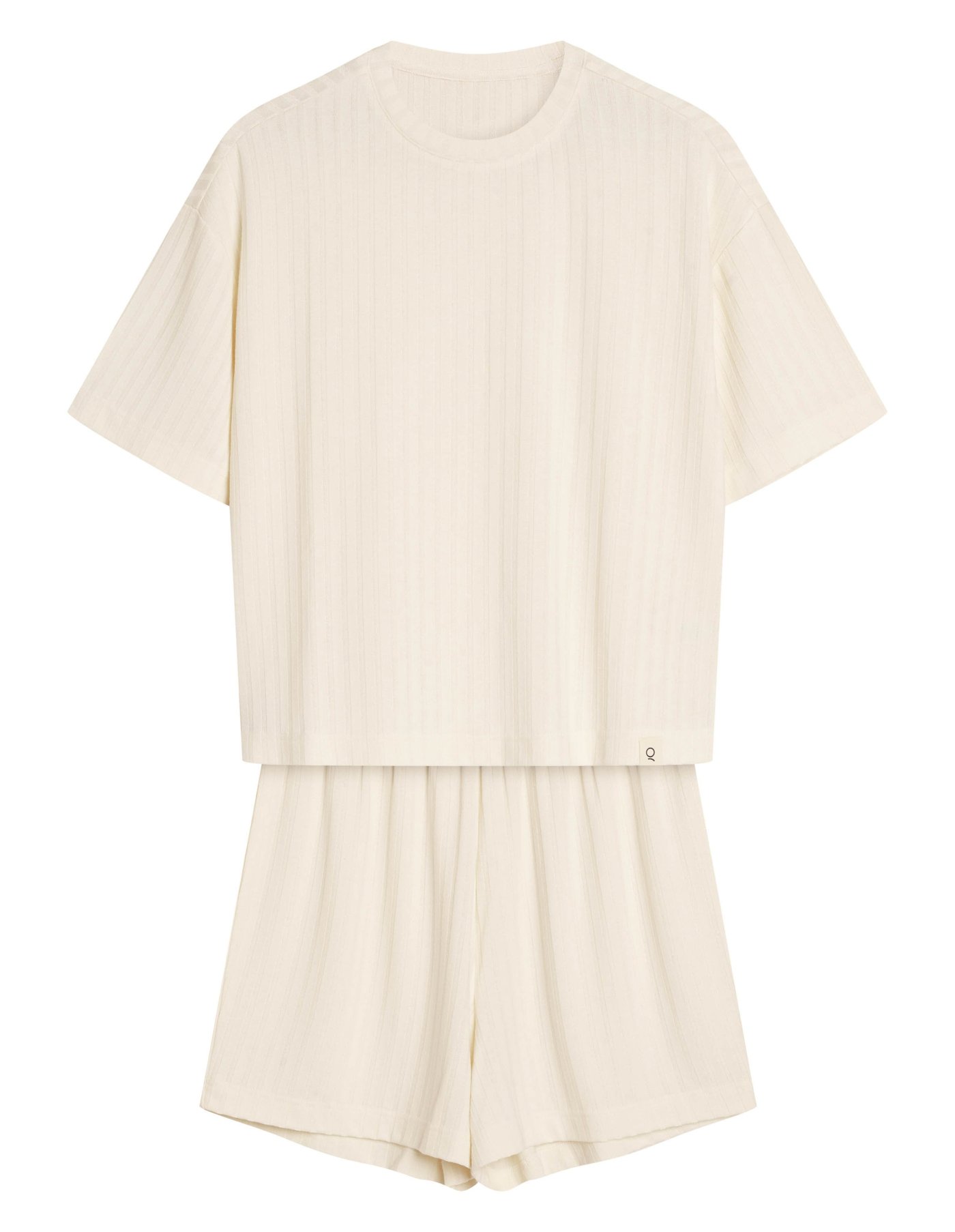 A Ravi krém színű női szett a stílus és a kényelem harmonikus ötvözete, amelyet a mindennapi komfortot értékelő nők számára terveztek. Az oversize szabású, rövid ujjú blúz és a laza, széles csíkos kötött anyagból készült sort könnyedséget és modern jelleget kölcsönöz az összképnek. Ideális választás meleg napokra és hétköznapi stílusokhoz. Az oversize divat, a könnyű, széles csíkos anyag és a laza sort hangsúlyozza a szabad stílust.