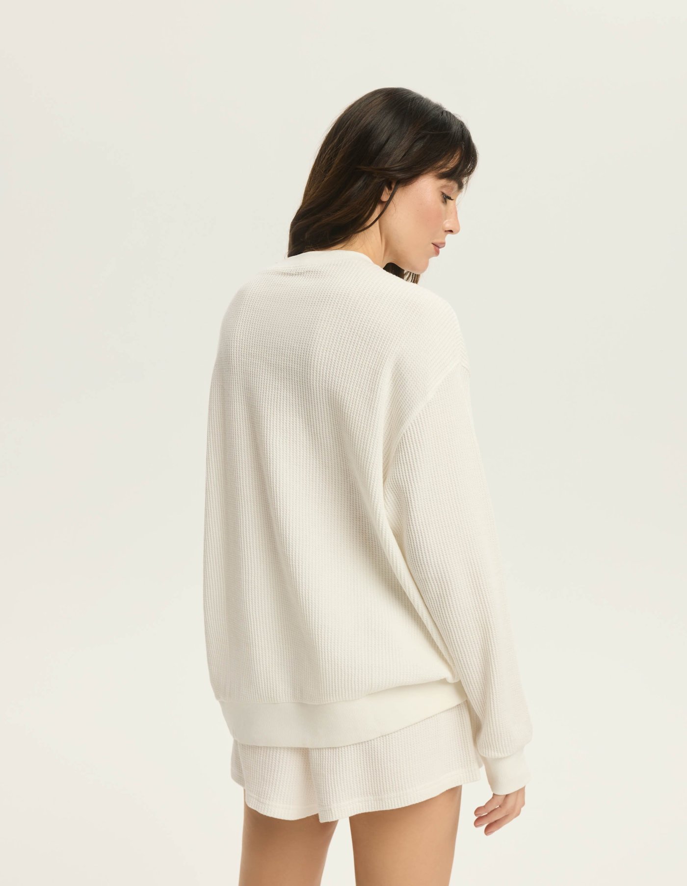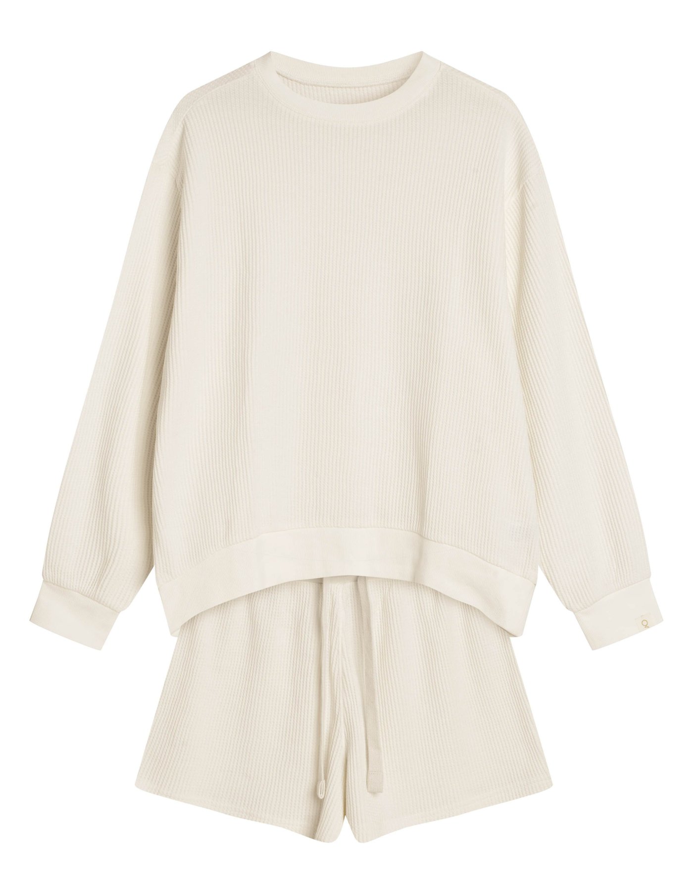 A Rumi egy blúzból és sortból áll. A blúza oversize szabású, amely kényelmes viseletet biztosít. A sort gumírozott derékkal és díszes zsinórral rendelkezik, ami még praktikusabbá teszi. A készlet három színben elérhető, ideális mindennapi használatra, és a waffle struktúrájú anyag különleges textúrát ad a darabnak.