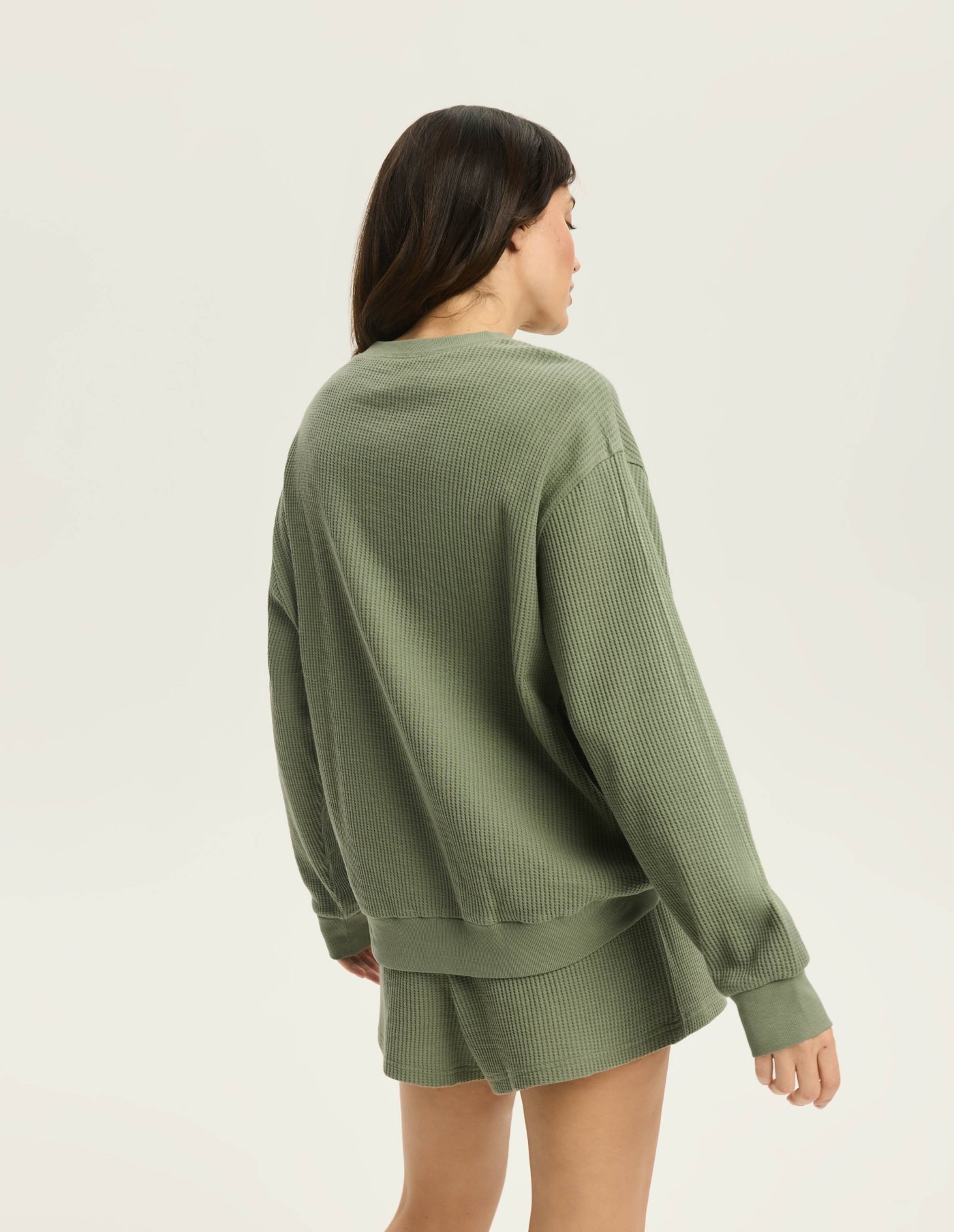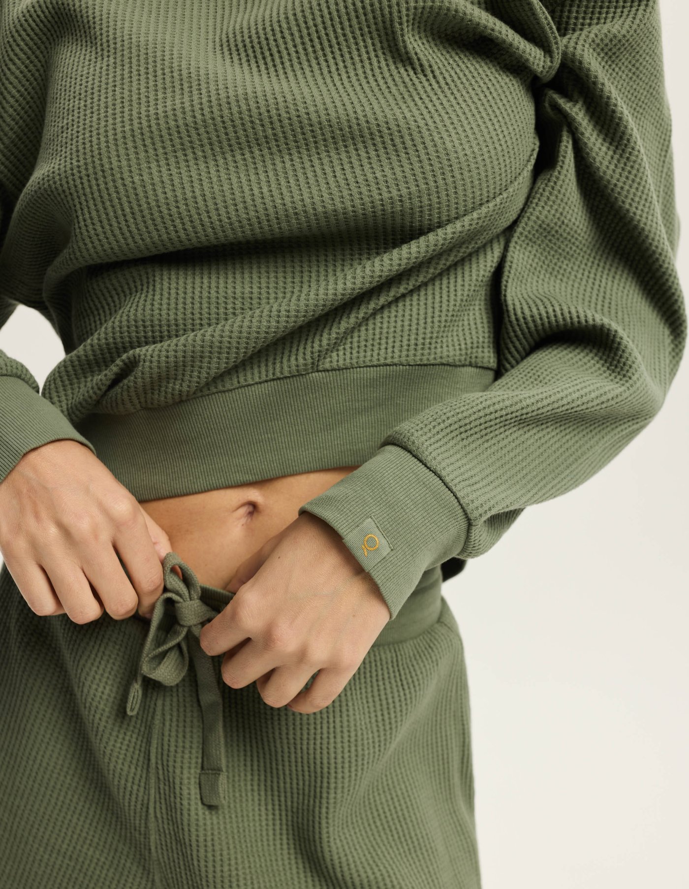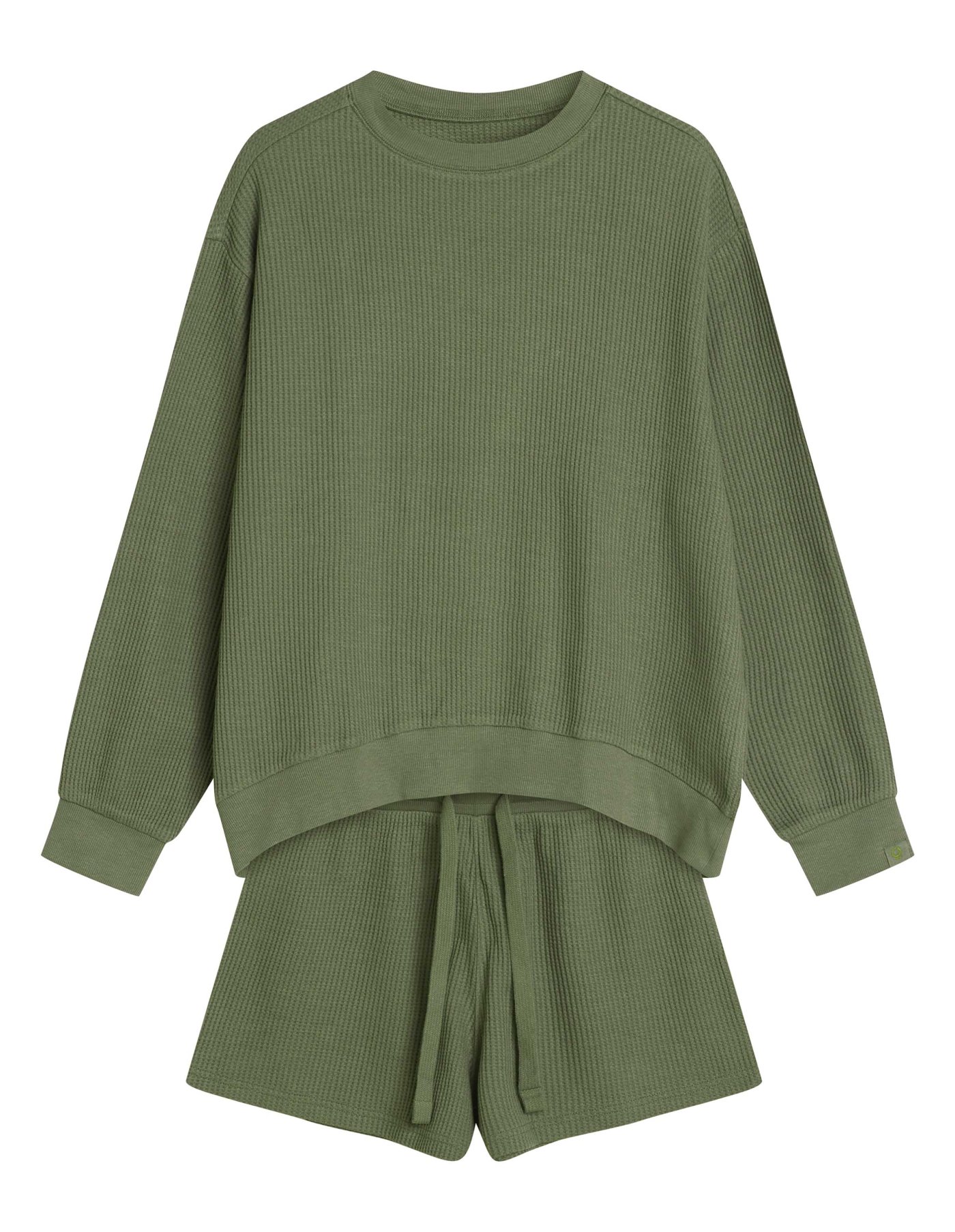 A Rumi egy blúzból és sortból áll. A blúza oversize szabású, amely kényelmes viseletet biztosít. A sort gumírozott derékkal és díszes zsinórral rendelkezik, ami még praktikusabbá teszi. A készlet három színben elérhető, ideális mindennapi használatra, és a waffle struktúrájú anyag különleges textúrát ad a darabnak.